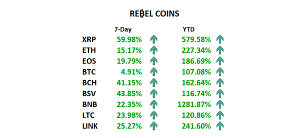 Crypto prices end week on significant high with median 7-day return on Rebel Coins at 24%