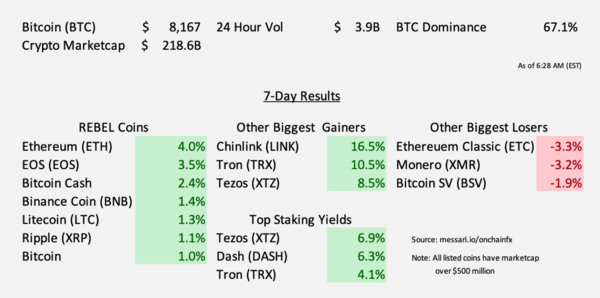 Cryptocurrencies appear to have stabilized across the board and are slightly higher on the week with the total marketcap of all digital currencies gaining $5 billion