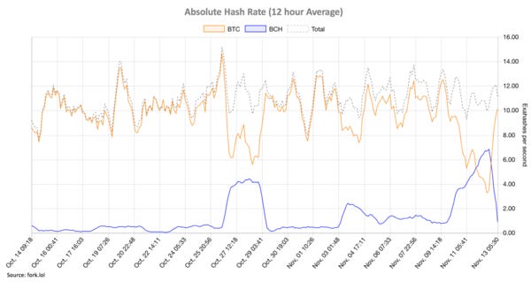 The amount of no-fee transactions added to Bitcoin (BTC) ’s mempool suddenly escalated to over 100 blocks (potentially a 16 hour backlog). BTC hashing which is typically at 10 Ehash/s dropped below 4.0 and BCH which averaged 1.03 Ehash/s during the month of October reached 6.75 and surpassed BTC’s hashrate for the first time. Last night the block reward for BCH was 3x, BTC. BUT this morning, calm has returned. See Chart of the Day below. The block reward for BCH is now 0.8 USD/Day for 1 THash/s vs. BTC’s higher 2.5 USD/Day.